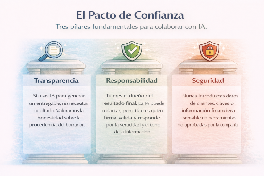 - Días 1-30 (Diagnóstico): Realizar una encuesta breve de seguridad psicológica. ¿Hay miedo? ¿Hay confusión? Publicar el «Pacto de IA».