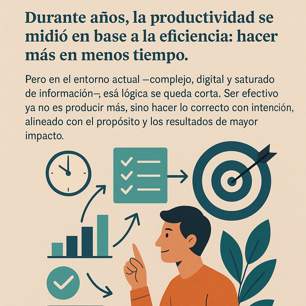 Durante años, la productividad se midió en base a la eficiencia: hacer más en menos tiempo. Pero en el entorno actual —complejo, digital y saturado de información—, esa lógica se queda corta. Ser efectivo ya no es producir más, sino hacer lo correcto con intención, alineado con el propósito y los resultados de mayor impacto. En este artículo exploramos cómo las empresas más inteligentes están pasando de la velocidad a la dirección, combinando el pensamiento estratégico, las herramientas de IA y los hábitos conscientes.