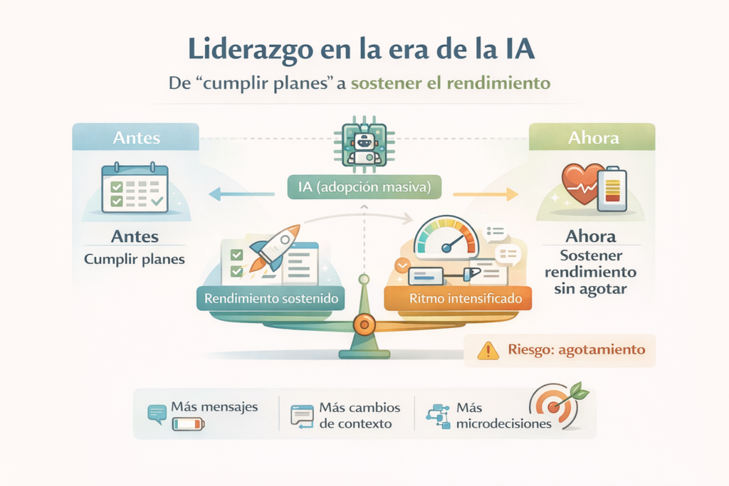 En 2026, el liderazgo ya no se mide por la capacidad de «cumplir planes», sino por sostener el rendimiento sin agotar a las personas. La adopción masiva de IA ha acelerado los entregables, pero también ha intensificado el ritmo: más mensajes, más cambios de contexto y más microdecisiones.