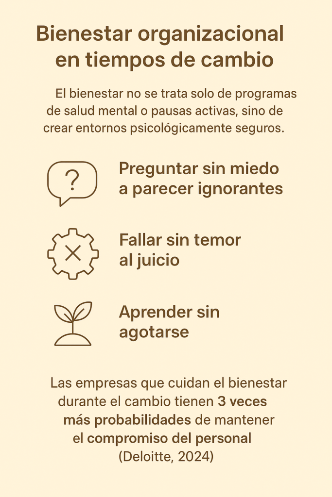 Las empresas que cuidan el bienestar durante el cambio tienen tres veces más probabilidades de mantener el compromiso del personal, según Deloitte (2024).