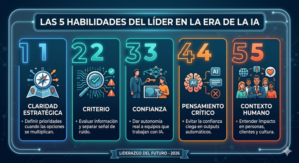 Por eso, en la era de la IA, el liderazgo evoluciona hacia algo diferente: menos control operativo y más claridad estratégica y criterio humano.