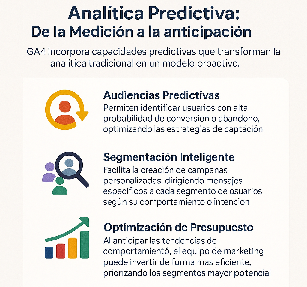 GA4 incorpora capacidades predictivas que transforman la analítica tradicional en un modelo proactivo. A través de algoritmos de machine learning, la plataforma es capaz de predecir comportamientos futuros y ofrecer información avanzada para la toma de decisiones.