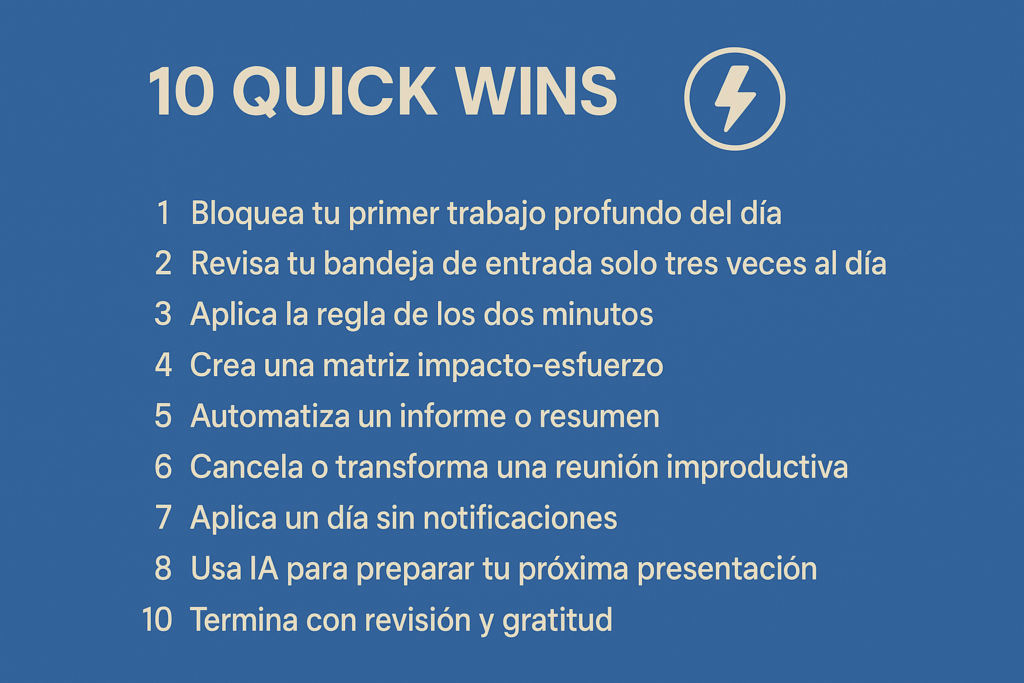 Hoy recopilamos 10 quick wins —acciones sencillas y de alto impacto— que puedes aplicar mañana mismo para ganar tiempo, claridad y energía.